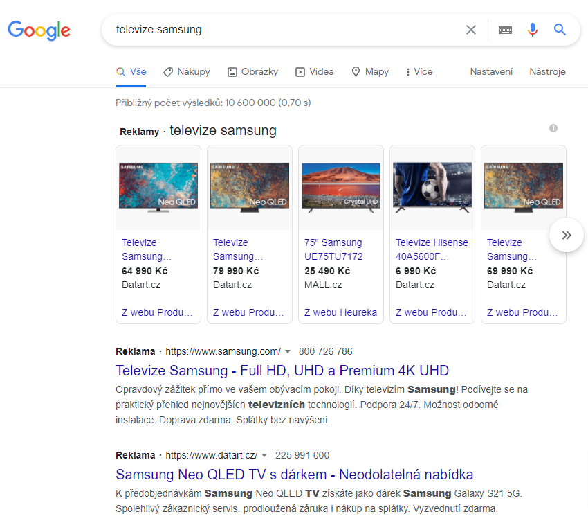 Několikrát jsem se v praxi přesvědčil, že pouhé zapnutí reklamních kampaní nepomůže. Navíc reklamní systémy mají svůj strop: od určité částky přestane mít reklama návratnost. V reklamách máte také omezený prostor a jste tam v kontextu s ostatními. Poznáte třeba z níže uvedeného obrázku, proč si koupit televizi u DATARTu nebo Mall.cz?