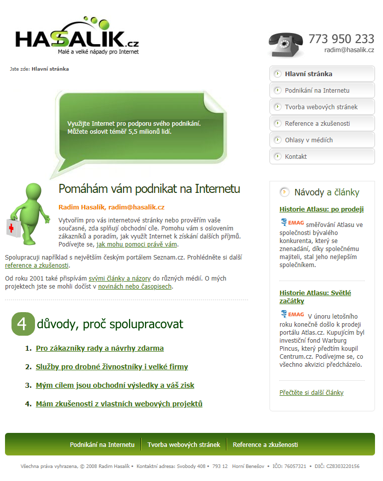 Živnostenský list jsem měl už z doby práce pro ITBIZ.cz. Z agentury jsem věděl, že firmy mají o spolupráci se specialisty na online marketing zájem. Proto jsem si pravděpodobně v dubnu 2008 vytvořil vlastní web Hasalik.cz. Stačila mi koupená šablona a 3D panáčci z placené fotobanky. Výsledek se dostavil záhy: o víkendech a večerech práce pro první zákazníky, přes týden pak online marketing v ESETu. Po dvou letech a šesti měsících následoval hodně odvážný krok. Odchod ze zaměstnání.