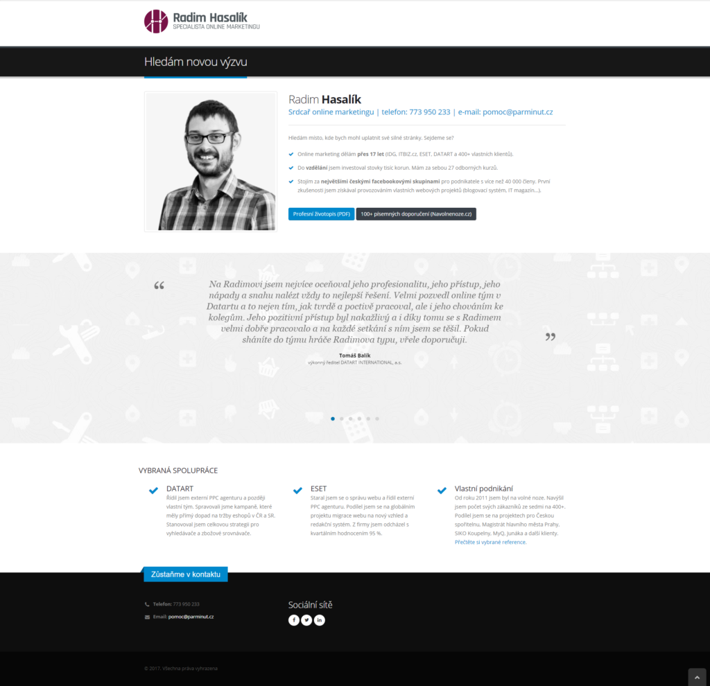 Protože odjakživa rád experimentuji sám na sobě, vyzkoušel jsem si změnu značky i webu. Chtěl jsem zpřístupnit výhody online marketingu i těm nejmenším, proto vzniklo ParMinut.cz. Vize byla taková, že i malý živnostník si může koupit čas specialisty online marketingu a neutratit za to desítky tisíc korun. Neobvyklá cenotvorba s účtováním po minutách se úplně neujala, ale značka mi zůstala až do dnešního dne.
